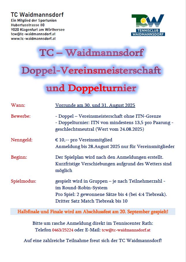 Auch in diesem Jahr veranstaltet der TC-Waidmannsdorf eine Doppel-Vereinsmeisterschaft sowie ein Doppel Turnier.
